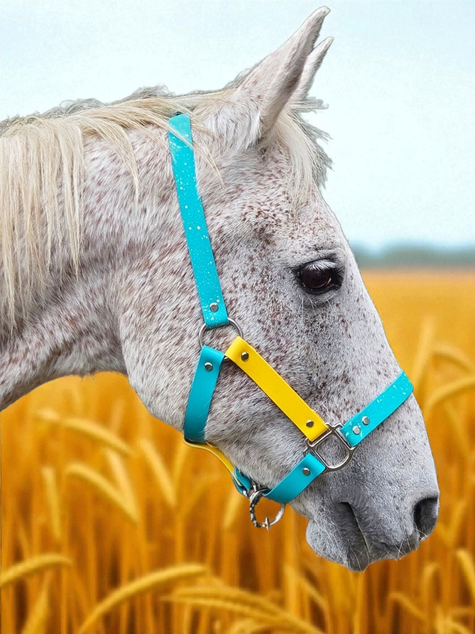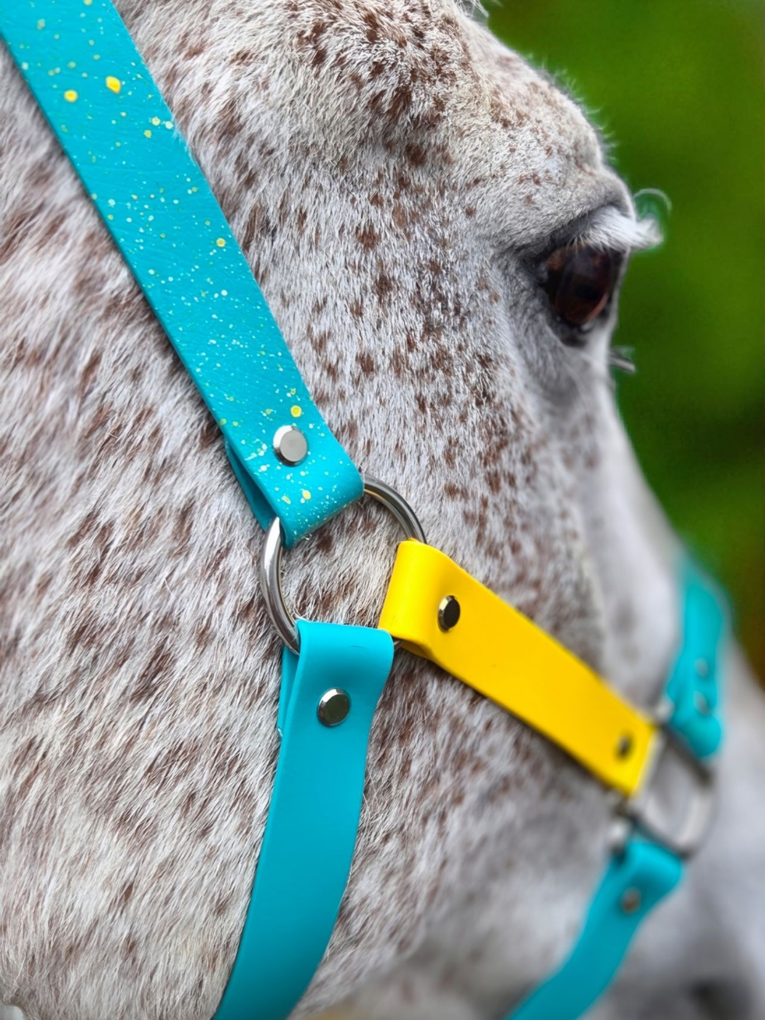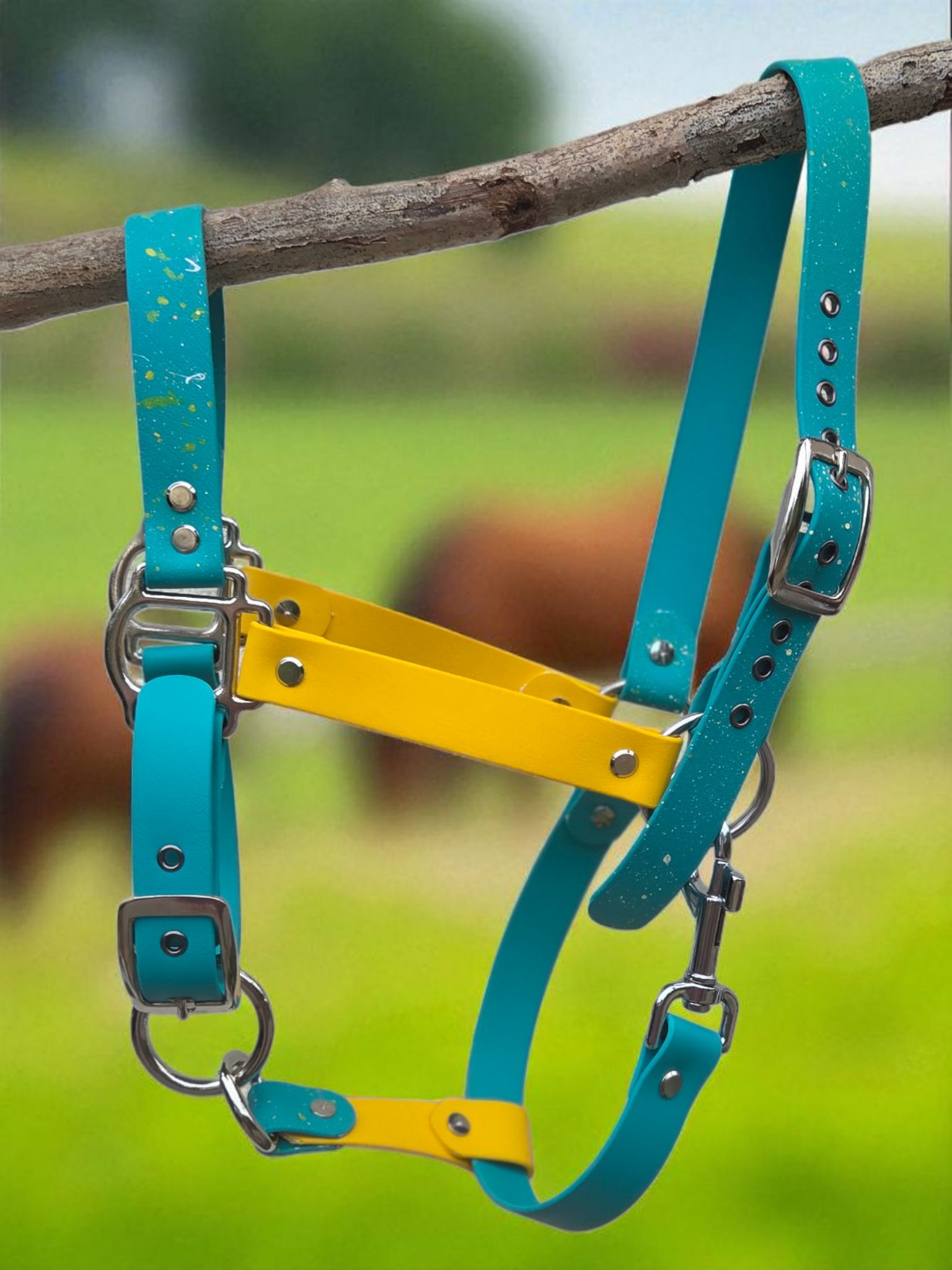 Alliez élégance et originalité grâce à ce licol Jaune et bleu Lagune. Les éclaboussures de peinture jaune et blanche en muserolle et tétière apporte une touche unique et originale. Disponible en taille COB