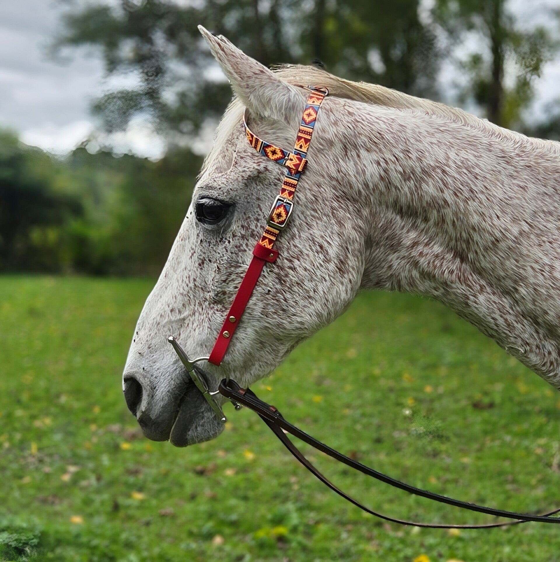 Voici notre tout nouveau bridon western à une oreille, au look amérindien coloré et audacieux ! Entre rouge profond et motifs géométriques éclatants, il apporte une vraie touche de caractère à ton cheval.
