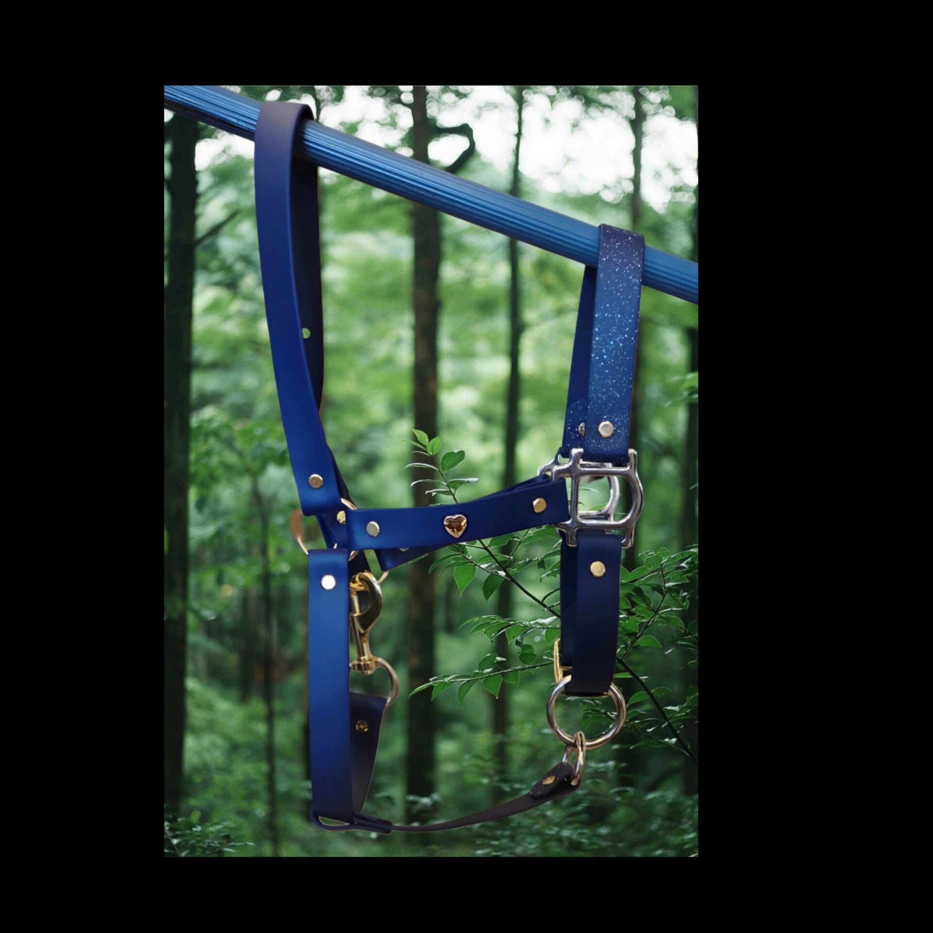Licol en biothane de couleur bleu marine avec des éclaboussures de peinture bleu et blanches.