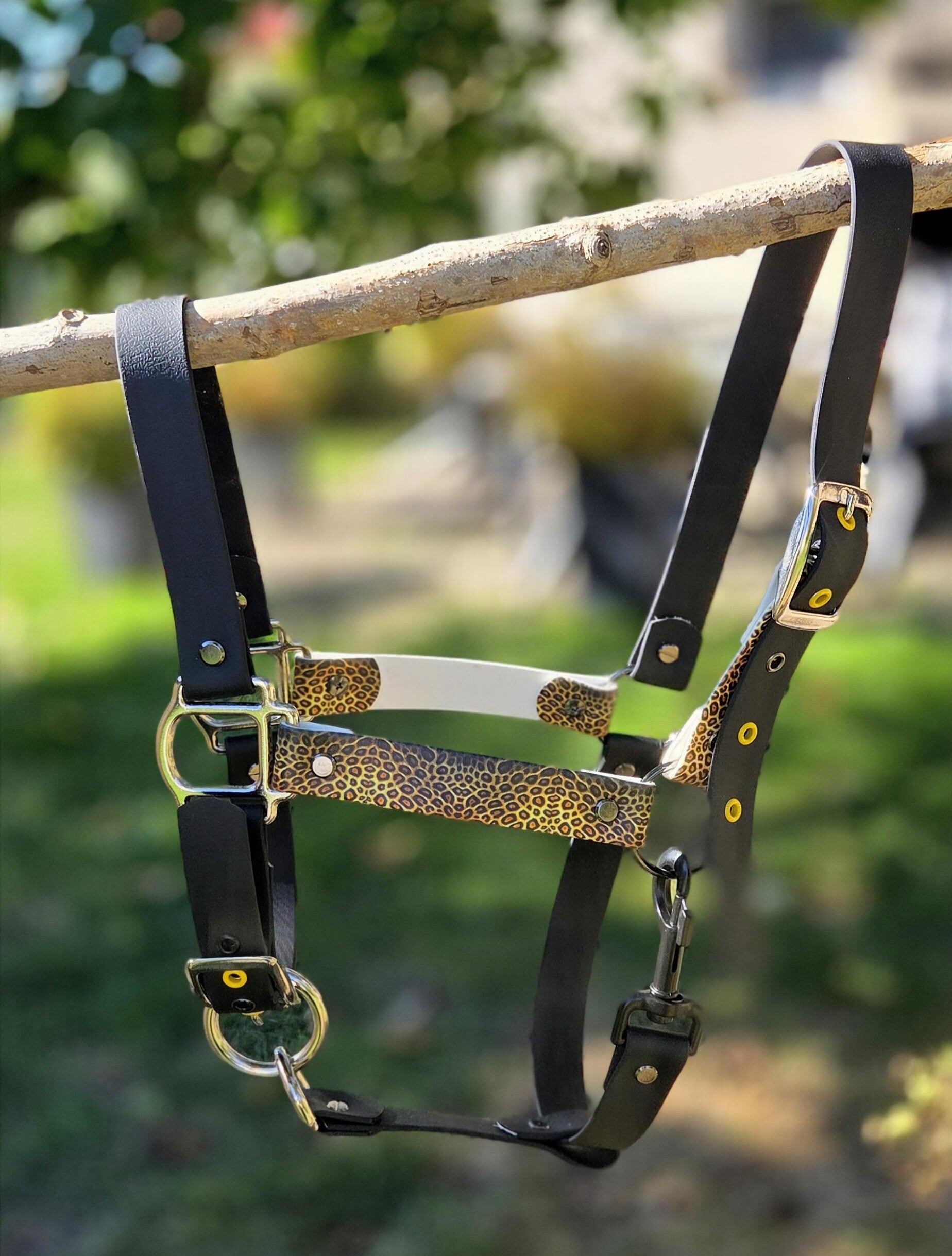 Mettez un peu de félin dans votre vie grâce à ce licol noir avec des montants léopard.