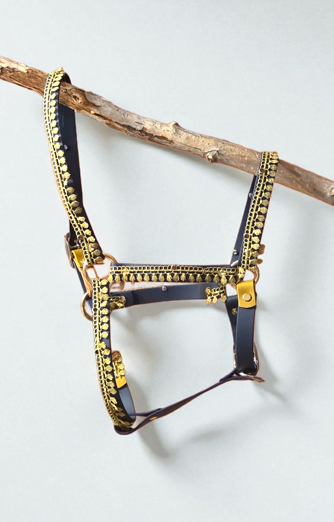 Licol en biothane fin 19 mm taille poney avec de la dentelle dorée tenue par des rivets strass marron. Pièce unique