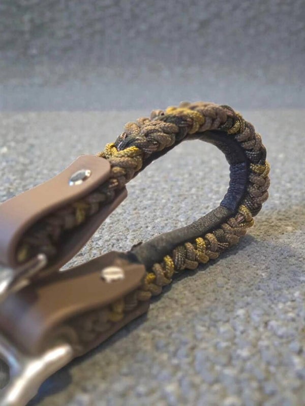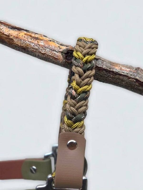 Licol Softbraid en biothane de couleur kaki et marron avec de la paracorde en muserolle.